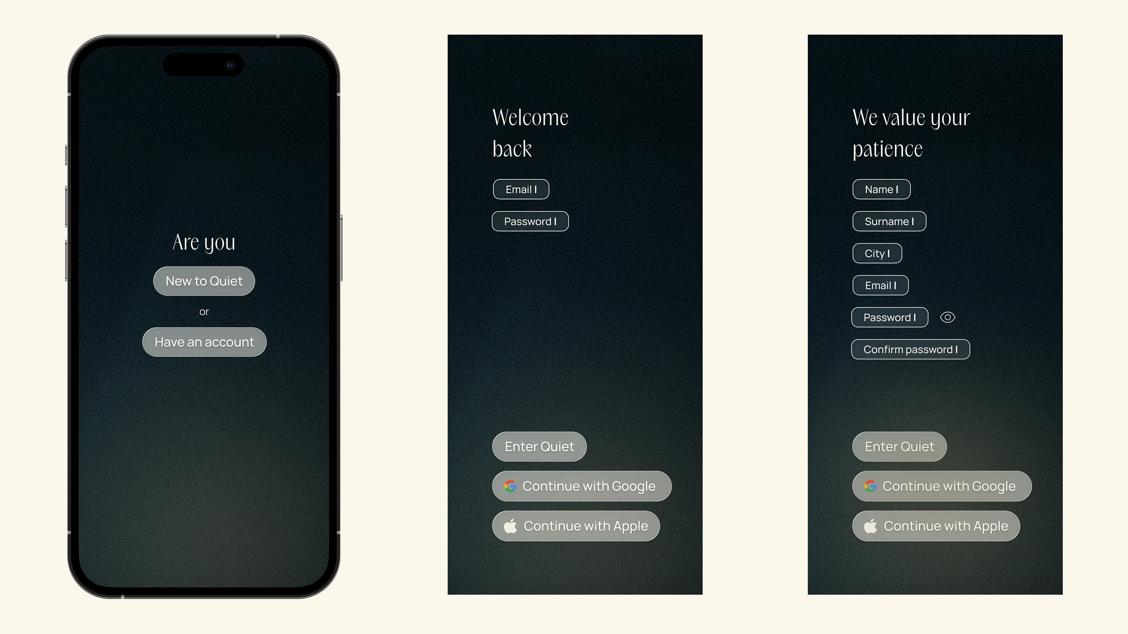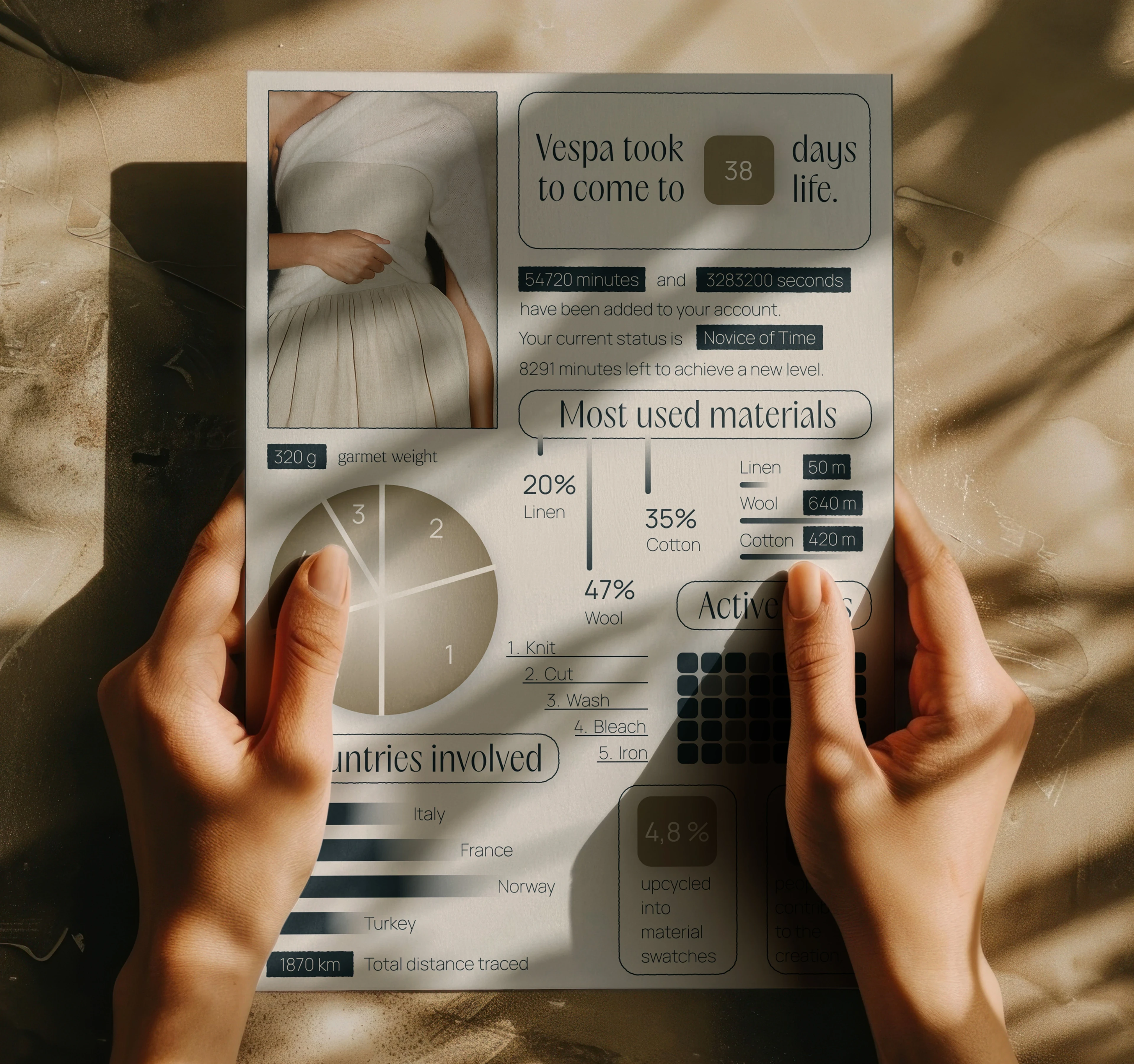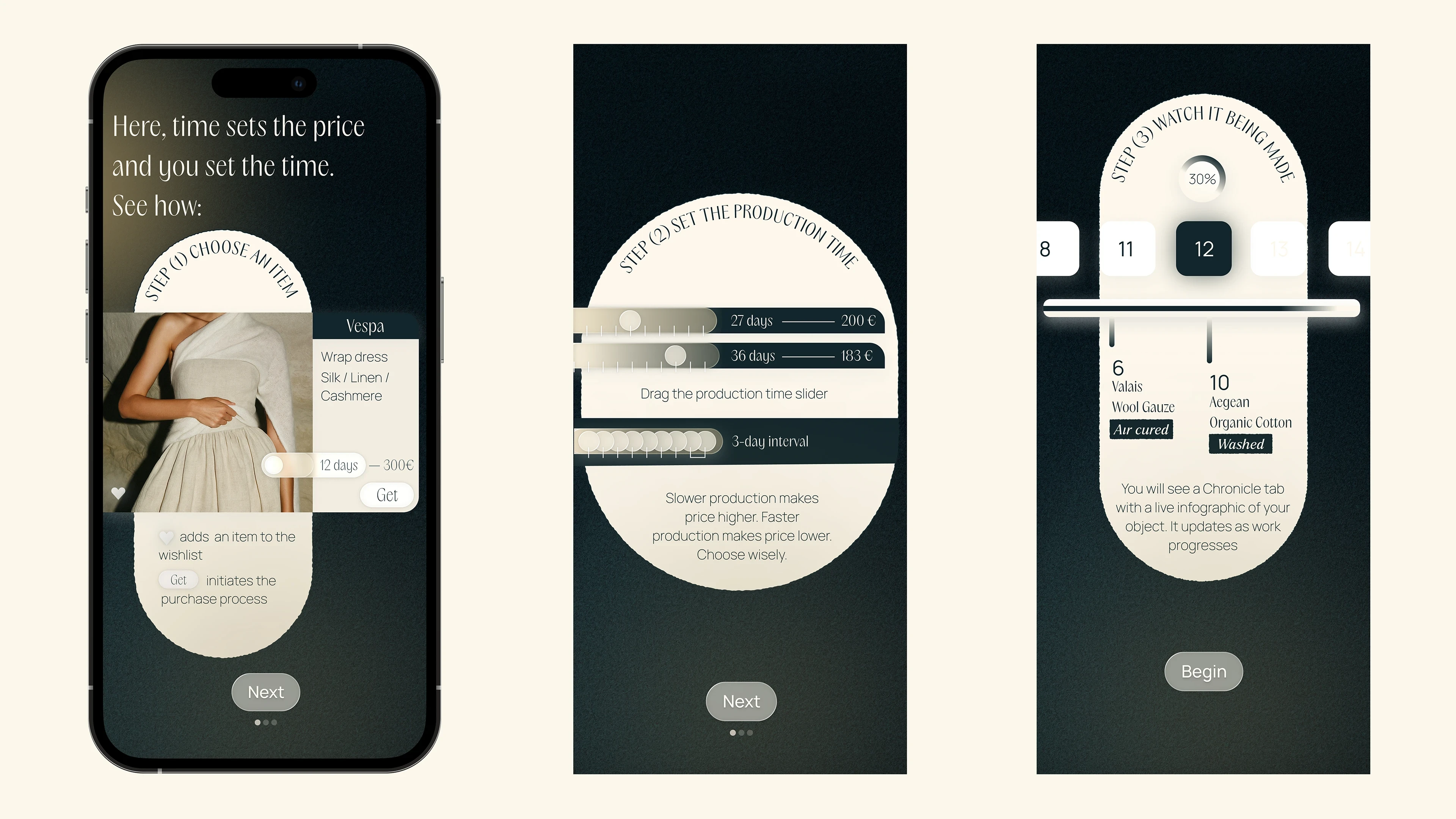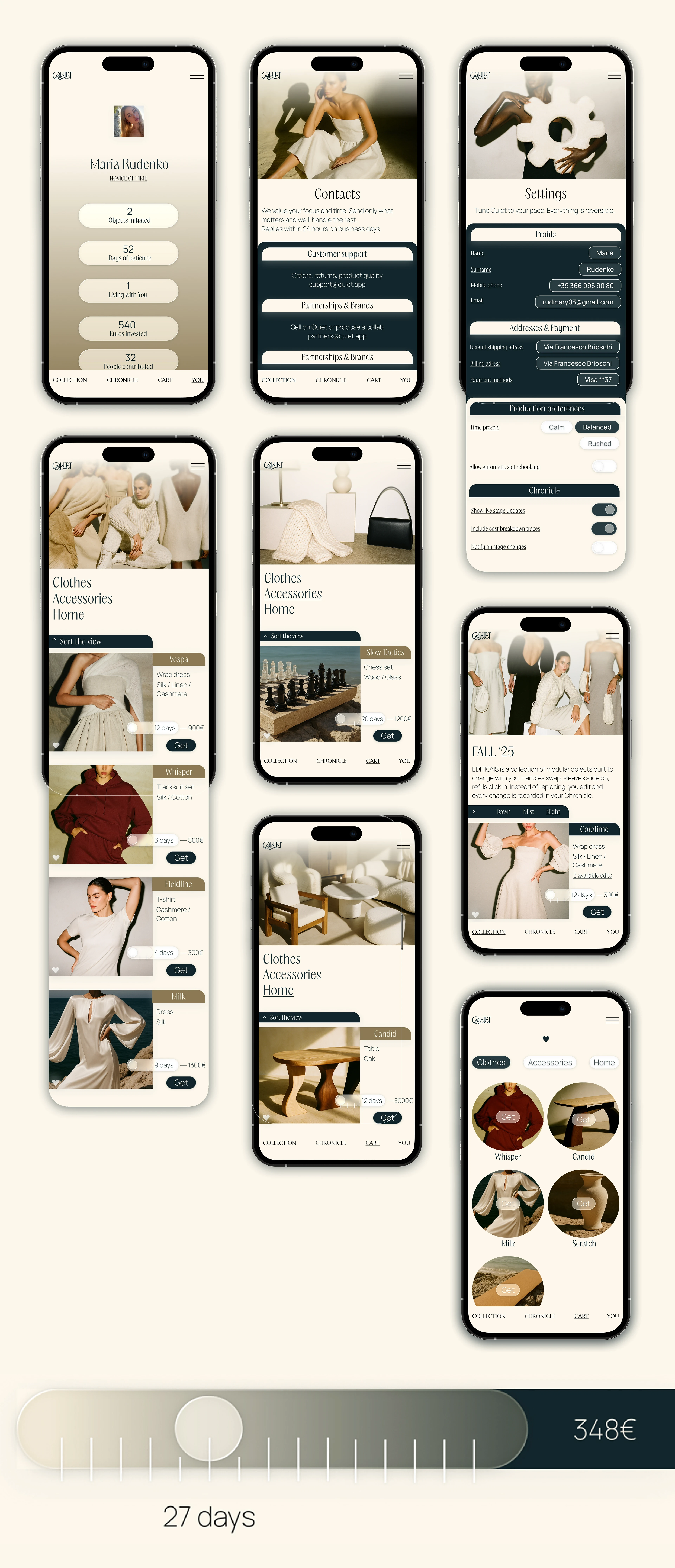QUIET is a slow-consumption marketplace where time is the main filter. You see the full story of production, materials and impact, and its price changes over time. Users can choose or adjust the production time that fits their real needs, so brands produce more intentional, made-to-order pieces.