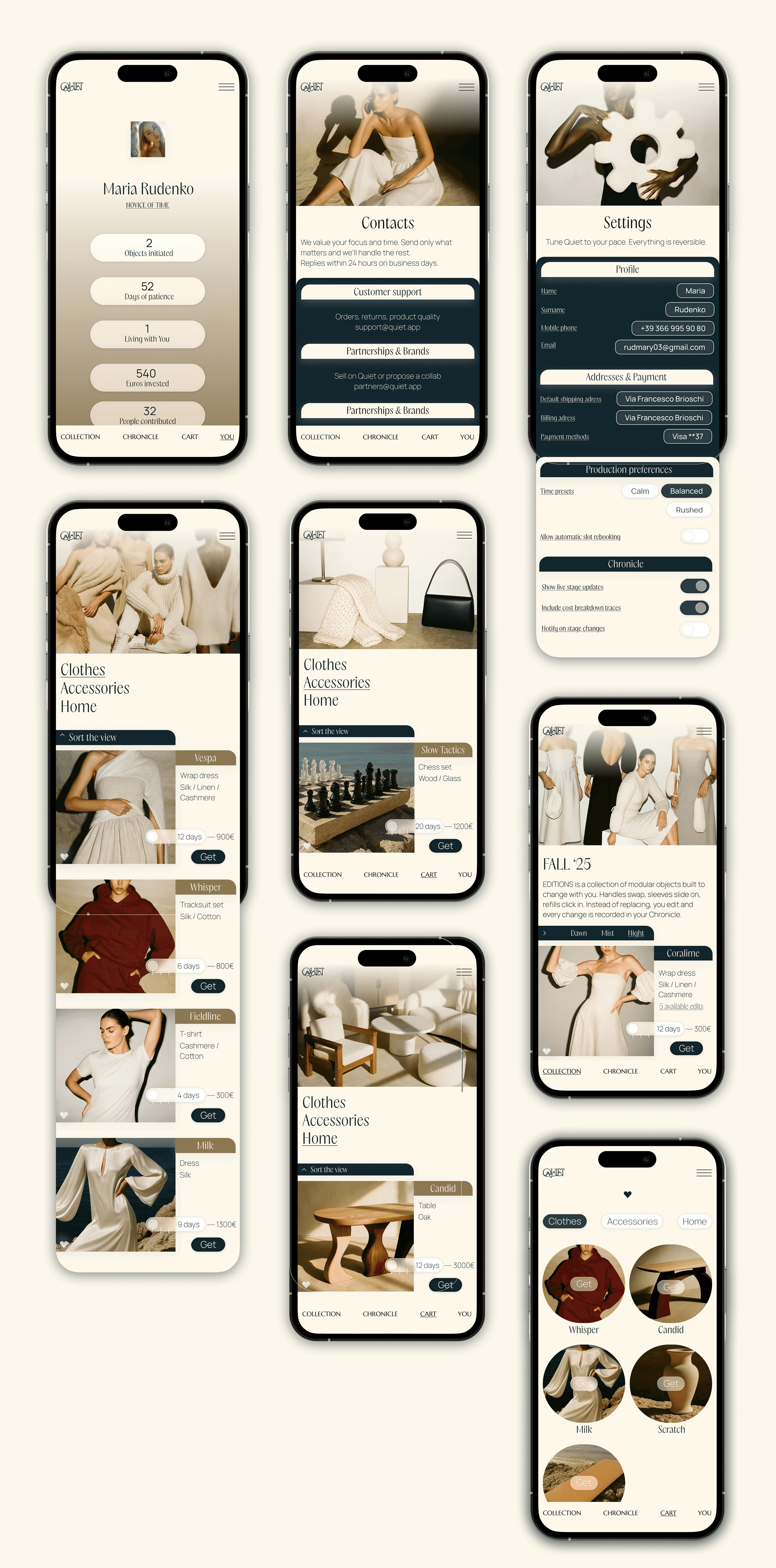 Quiet — digital-маркетплейс для независимых брендов и ремесленников, ориентированный на осознанное потребление, в котором время становится частью пользовательского опыта. Quiet создавался как альтернатива быстрым покупкам.